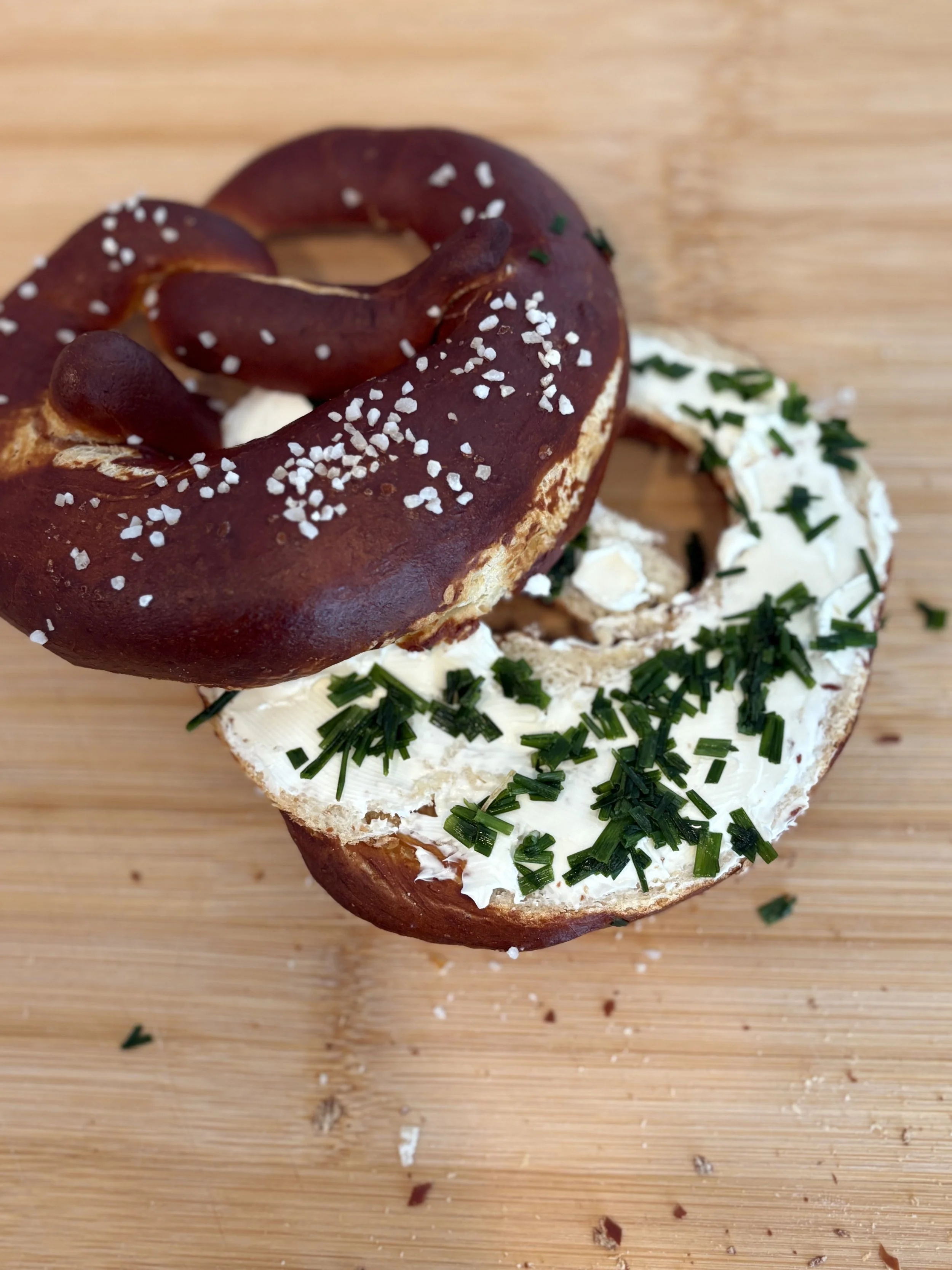 Cut pretzel open, including arms if possible, and generously spread cream cheese